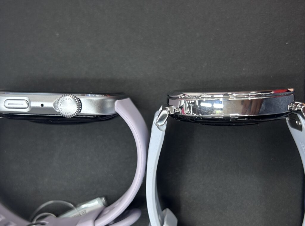 ※実機で装着したHUAWEI WATCH FIT4とGT5の比較。FIT4の軽さが際立つ