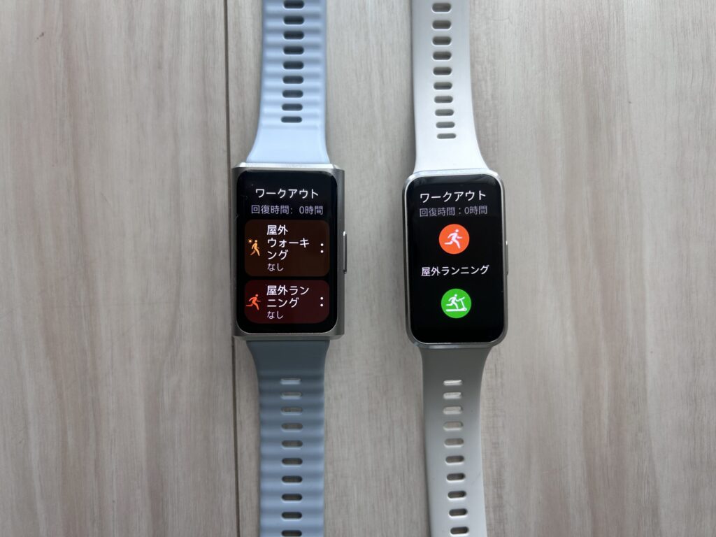 Band 11 ProとBand 10の「ワークアウト」モードと「屋外ランニング」モードを並べて見え方を比べてみました。