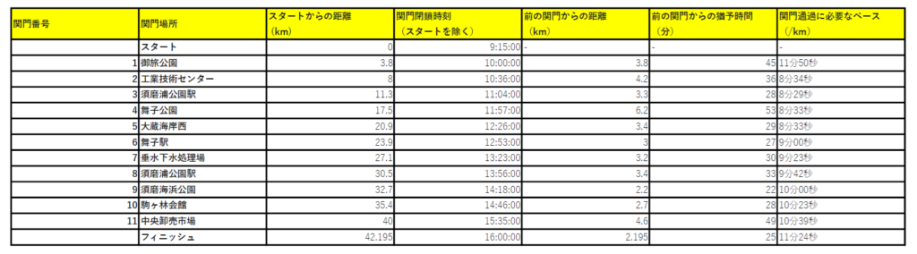 次の表は、第2ウェーブの先頭(Gブロック・9時15分スタートライン通過)の関門通過に必要な最低ラインのペース配分表です。