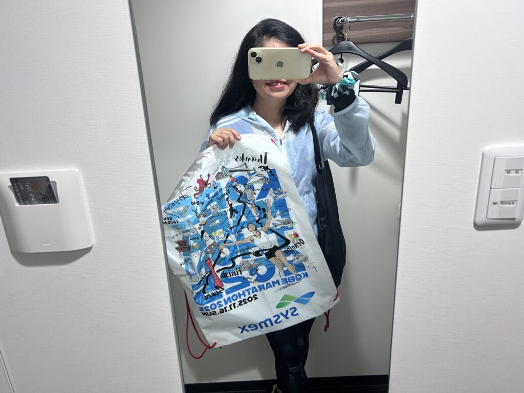 キャリーケースなどマラソンに不要な荷物は、大会前日、ランナー受付前に2泊目のホテルに立ち寄り、預けさせてもらいました。前泊した新大阪のホテルには、神戸マラソンの手荷物預け袋に入る程度(折りたためる軽量ボストンバッグを使用)の、必要最低限の荷物のみ持って泊まりました。