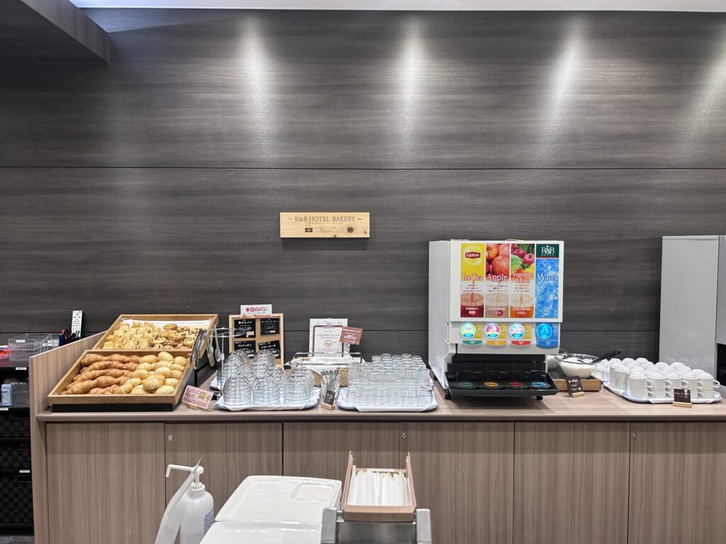 朝食はバイキング形式。パン、シリアル、カレーライスなどいろいろ。サラダやフルーツ、ヨーグルトもあります。