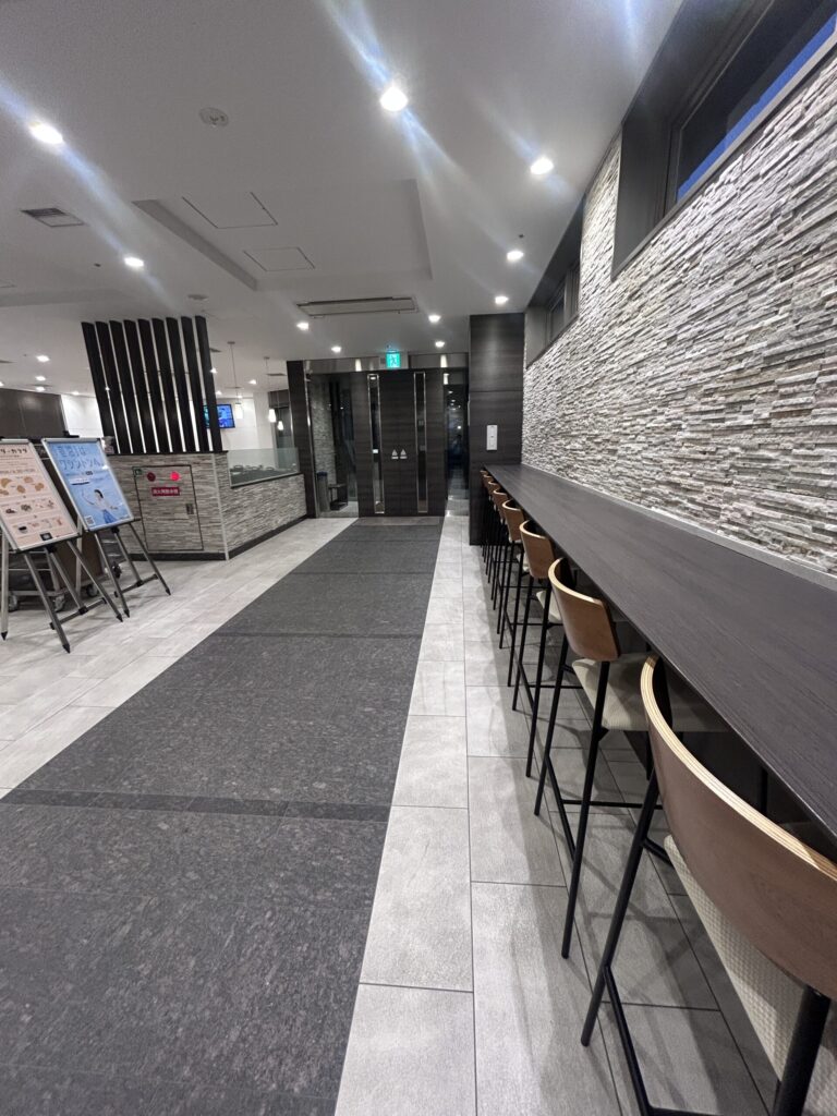 朝食会場は1階フロント横(下の写真左手)。玄関そばのカウンター席も利用可能です。