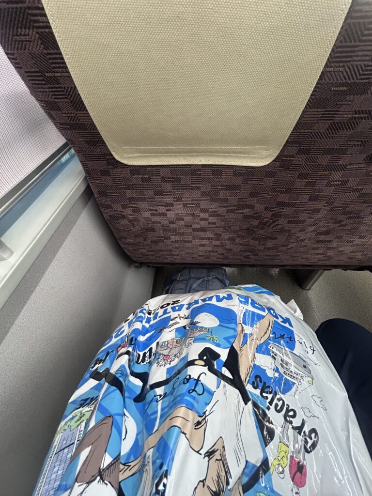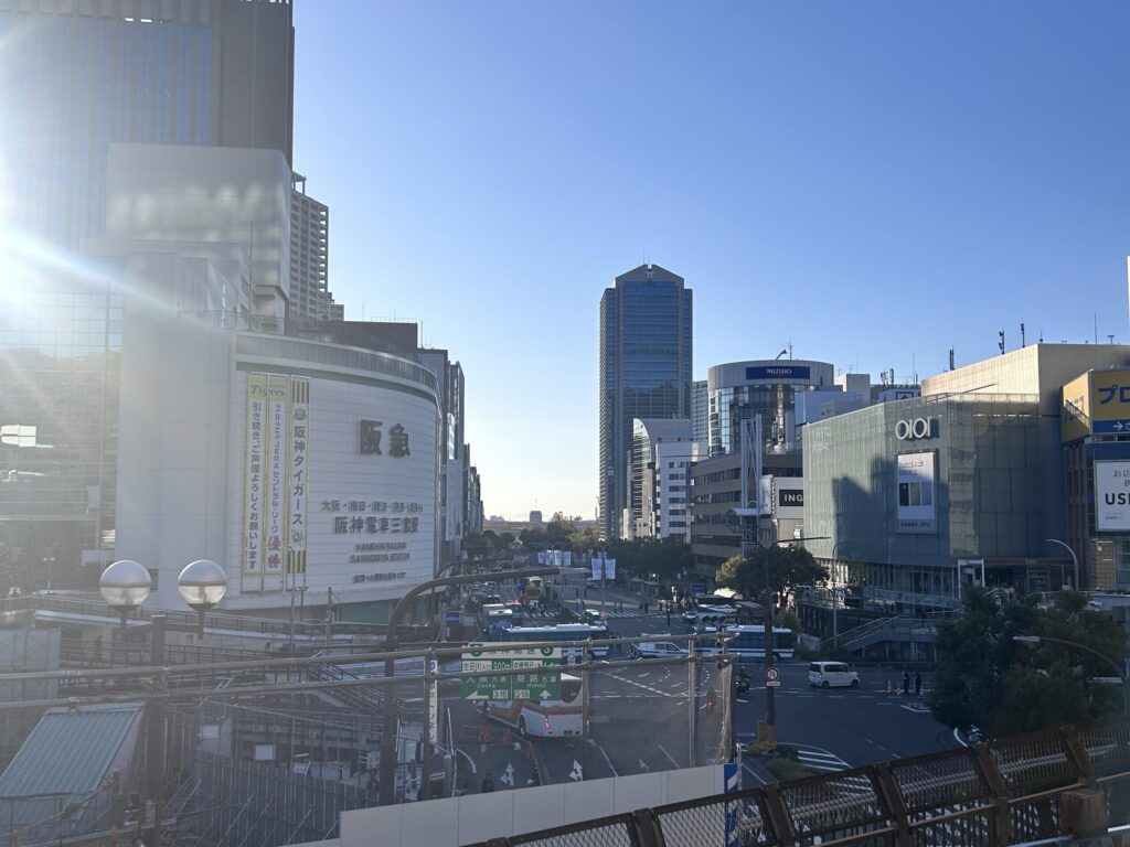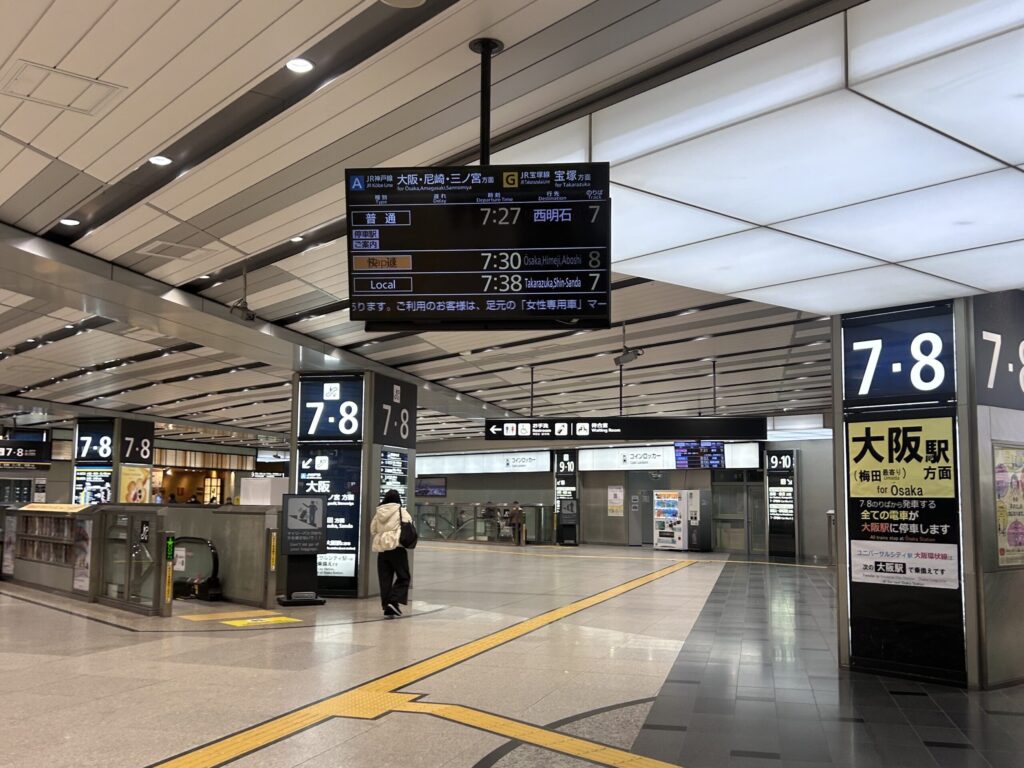 日曜の早朝。列車内に乗客はけっこういましたが、座席はぽつぽつ空いていて、運よく座れました。次の駅は大阪。ここからぎゅうぎゅうになりました。もし梅田周辺のホテルに泊まっていたら、座れなかったと思います(宿泊料金が高くて泊まれなかったのですが、かえってそれがよかった)。
