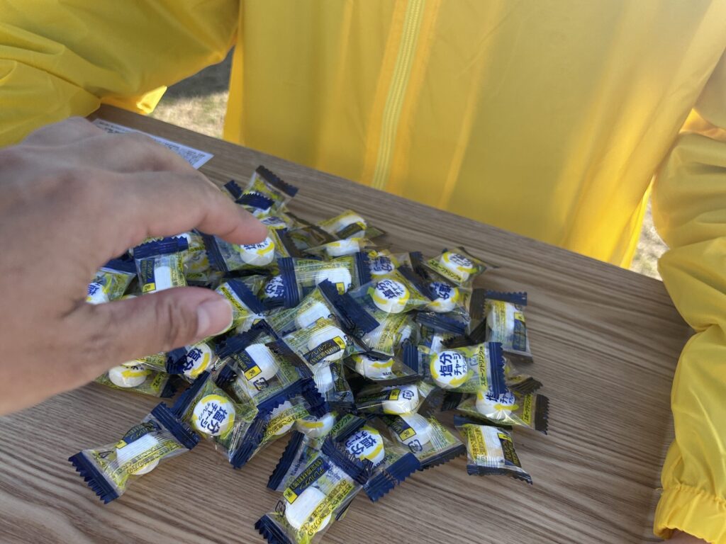 遅刻しそうで朝ご飯を食べなかった人、レース中の携帯食が欲しい人は、スタート前に買える最後のチャンスです。