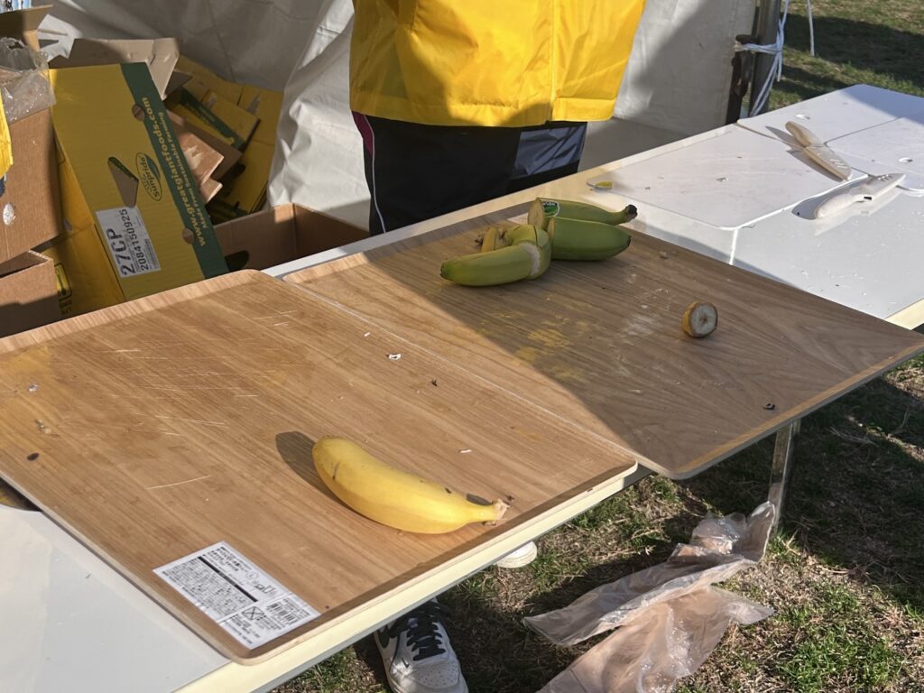 私もバナナと塩分タブレットをいただきました。バックパックのポケットに入れて、走っている間に食べることにしました。
