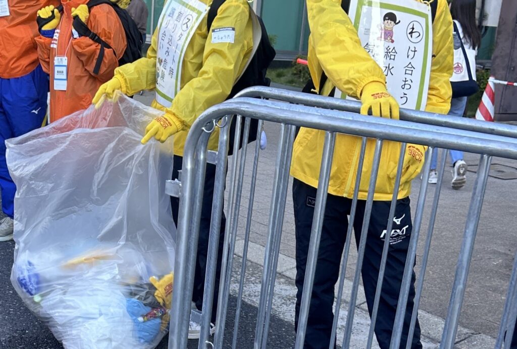 高校生ボランティアのみなさんの胸に、ランナー標語が。「スタート時 割り込み危険 譲り合い」。