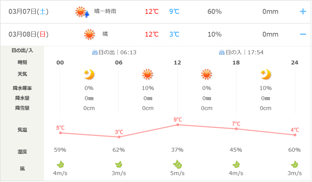 今週末の予報は最高12℃ですが、最低気温が3℃。また特有の「強風」には要注意です。
