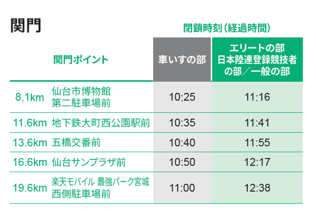 - 仙台ハーフは、遅いランナーにはとにかく関門が厳しい 。仙台陸協の審判員さんや自転車の係員さんが「(関門閉鎖まで)あと●分」とよく声をかけてくれます。周りの状況も見ながら、落ち着いてペース調整していきましょう 。