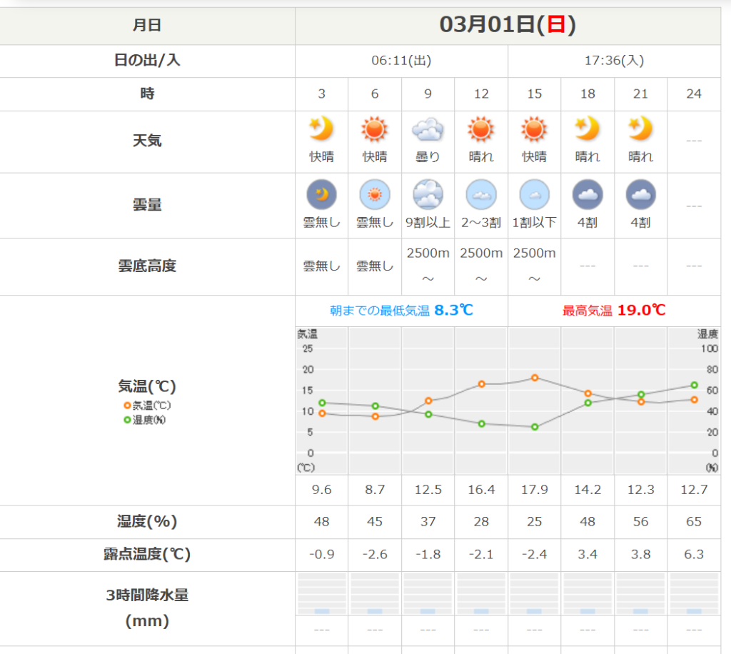 | 項目 | 今日(3/2) | 明日(3/3) |