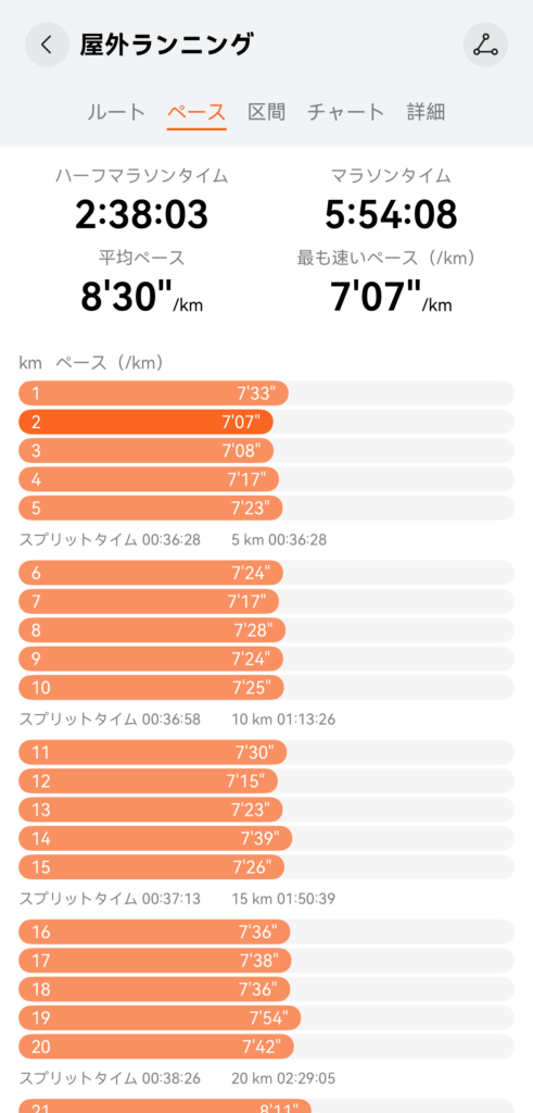 今回の私の記録は、ネットタイムで6時間12分台。平均ペースは8’30″/kmでした。