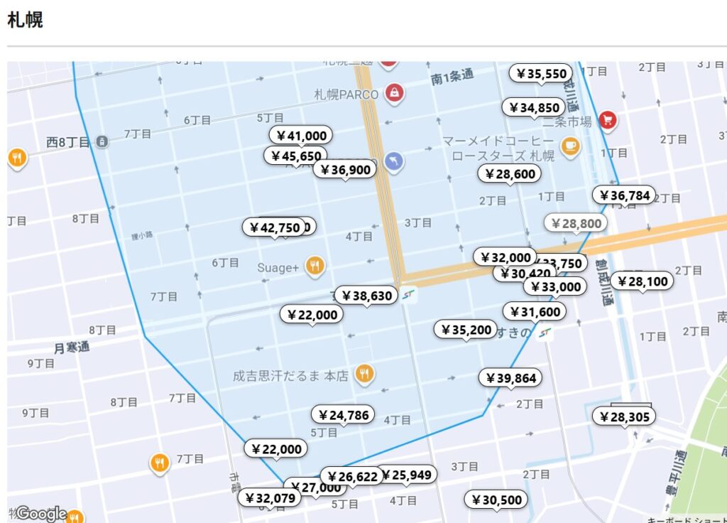 大会の前日(宿泊日)から6ヵ月前を目途に、Googleマップで立地と価格のバランスを俯瞰。 相場がつかめます。